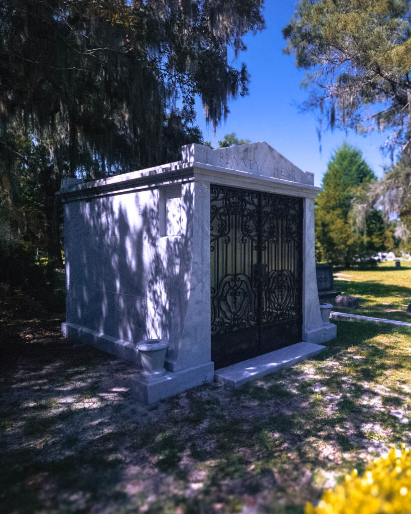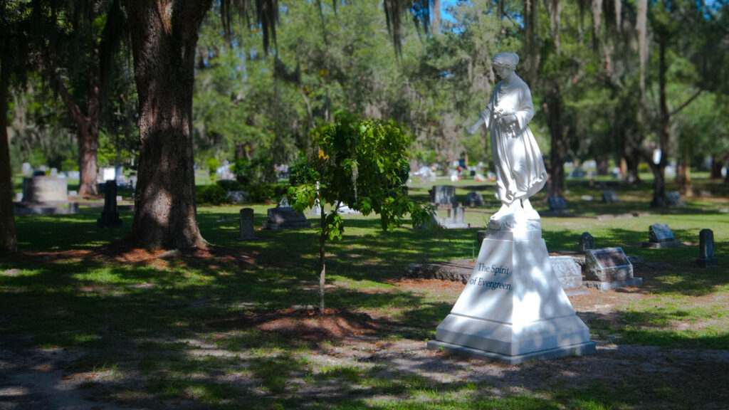 n February of 1856, the ground now known as Evergreen Cemetery received its first burial from the newly named community of Gainesville, Florida. The infant daughter of a well-to-do cotton merchant and landowner James Tilatha Thomas and his first wife, Elizabeth Jane Hall Thomas, died at the age of 10 days. They laid her to rest in a place of serene natural beauty beneath a young cedar tree, roughly in the center of vast acreage owned by Thomas that extended from Boulware Springs north to present-day Depot Avenue. Eight months later, in October 1856, Elizabeth died at the age of 40 years and Thomas buried her in the same grave as their infant daughter. Thus, the grave is a double grave, and is marked by a rare and elegantly simple headstone carved by W.A. White, a well-known stonemason from Charleston.